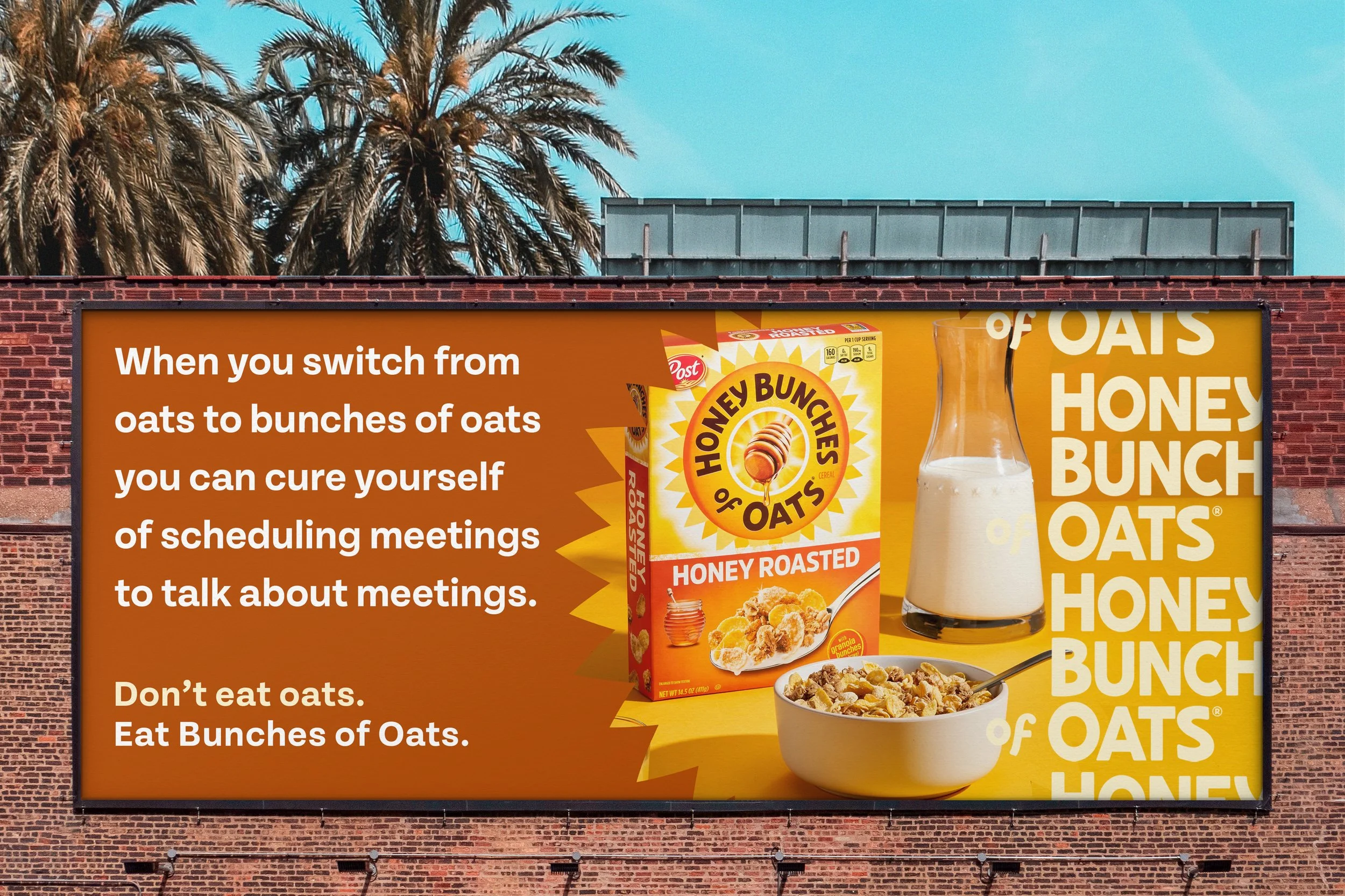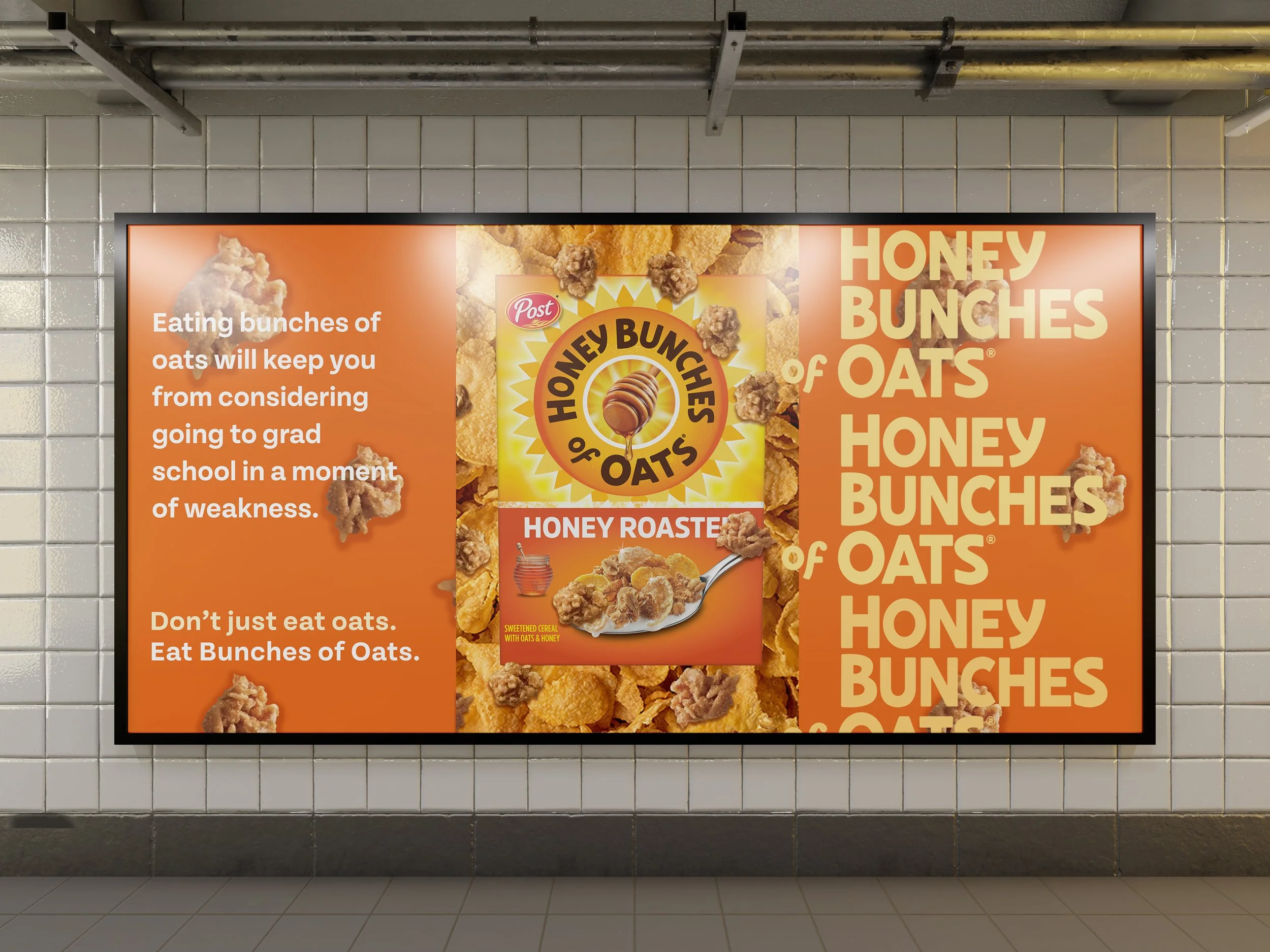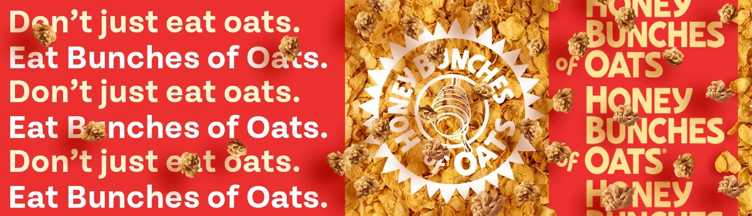 Honey Bunches of Oats is a well liked cereal that people forget about if they don’t run ads. We pitched and won this business, leading the redesign of the brand and work around the central idea: Everyone knows oats are great for you so what can bunches of oats do for you? Our brand redesign included a new graphic system for social, OOH, static assets as well as nine spots for a TV campaign you’ve probably seen running on Thursday Night Football. Created at Carmichael Lynch with Chromista as a TV production partner.